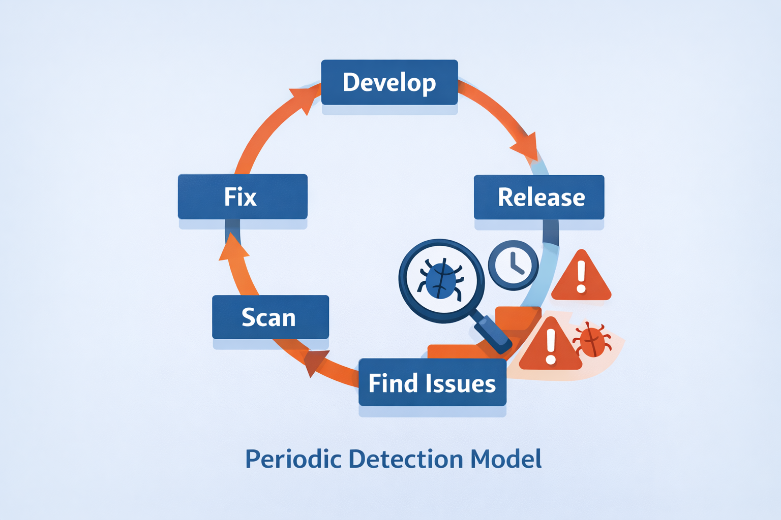 In the traditional reactive security approach, issues are detected periodically after the release is done.